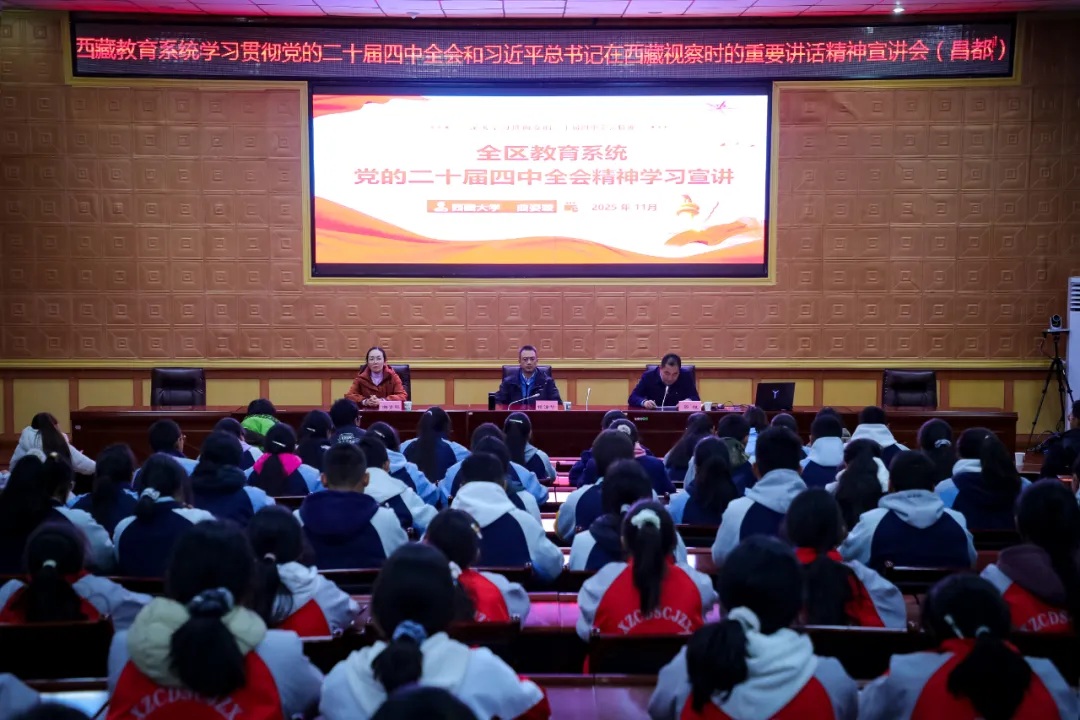 2025年11月25日,全区教育系统党的二十届四中全会精神和习近平总书记在西藏视察时的重要讲话精神专题宣讲会在昌都市教育局顺利举办。此次活动作为全区教育系统宣讲工作的重要环节,通过“进校园、进课堂、进头脑”,为西藏教育强区建设凝聚思想共识与奋进力量。教育厅思政处二级调研员侯泽华同志带队全区教育系统宣讲团莅临指导,西藏大学马克思主义学院曲姿璇副教授担任主讲嘉宾。昌都市教育局党组副书记、局长周凯出席活动,局机关干部及市直属初高中师生代表近200余人参加本次宣讲活动。