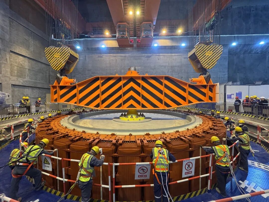 拉哇水电站坐落于西藏自治区芒康县与四川省巴塘县交界的金沙江干流之上,是国家 “十五五” 规划重点工程,也是金沙江上游水风光一体化基地的核心组成部分,总装机容量 200 万千瓦,为同类型项目中坝高最高的混凝土面板堆石坝电站。此次吊装的首台机转子直径 13.43 米、高 3.10 米,总重约 1007 吨,是电站机组中体量最大、重量最重的核心部件。
