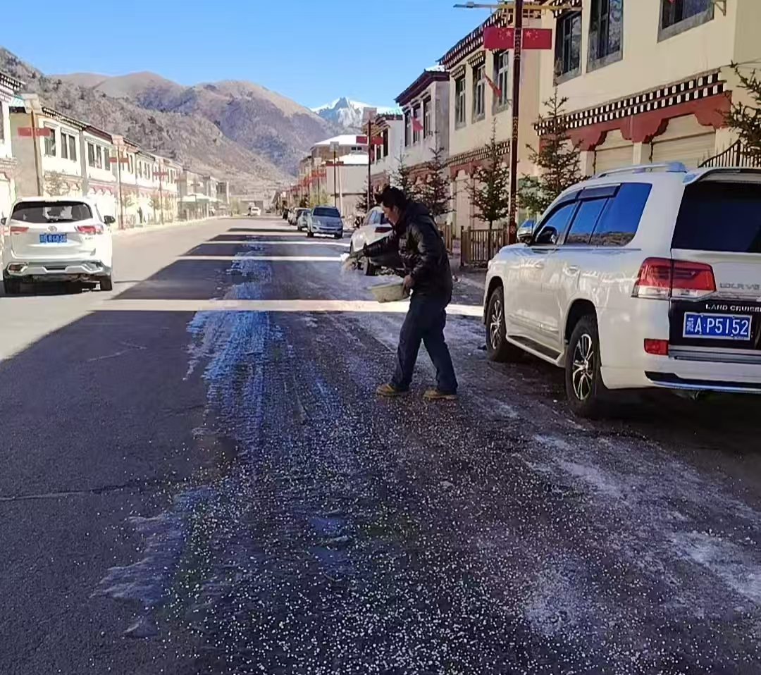 11月28日,政协委员益西朗加在冰雪道路上撒盐除冰除雪,防止来往车辆打滑,确保过往群众安全通行。