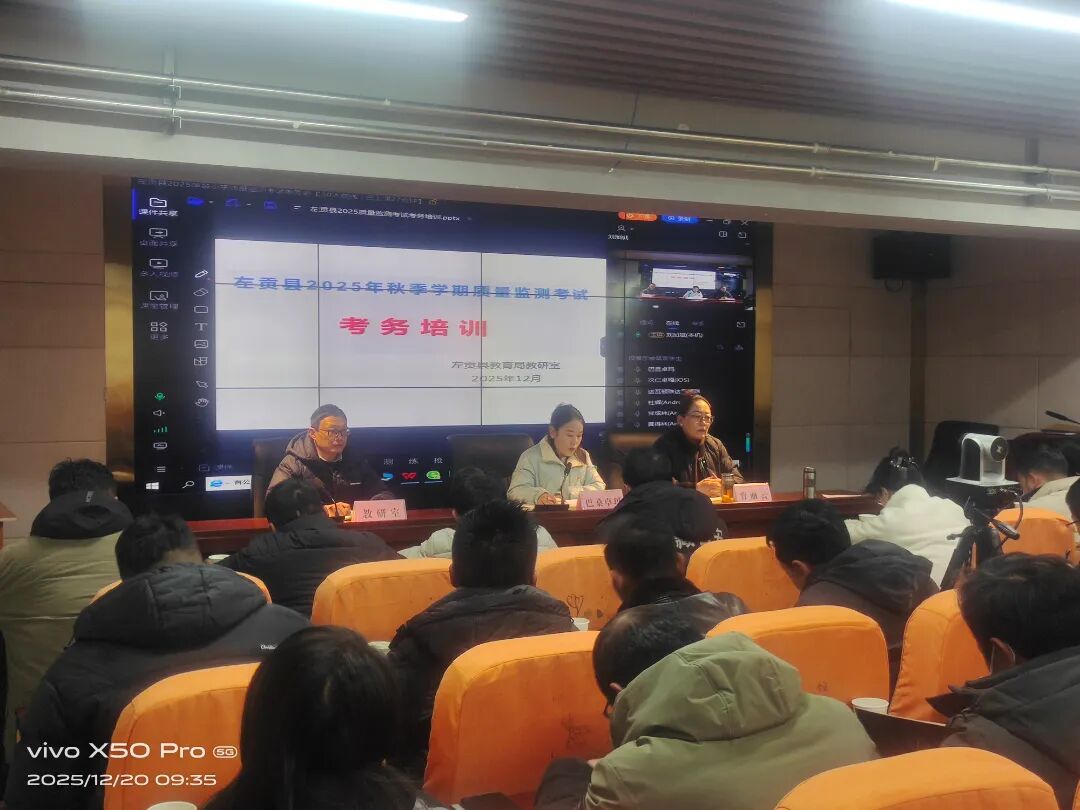 为高标准、严要求保障2025年秋季学期中小学质量监测考试左贡县考点工作规范有序实施,切实提升考务管理精细化水平与应急处置能力,12月20日上午9时30分,左贡县教育局以“线上+线下”融合模式,组织召开全县质量监测考务工作专项培训会。县教育局教研室分管领导、相关科室负责人,各考点主考、副主考、考务工作人员及全体监考教师共300余人参训。