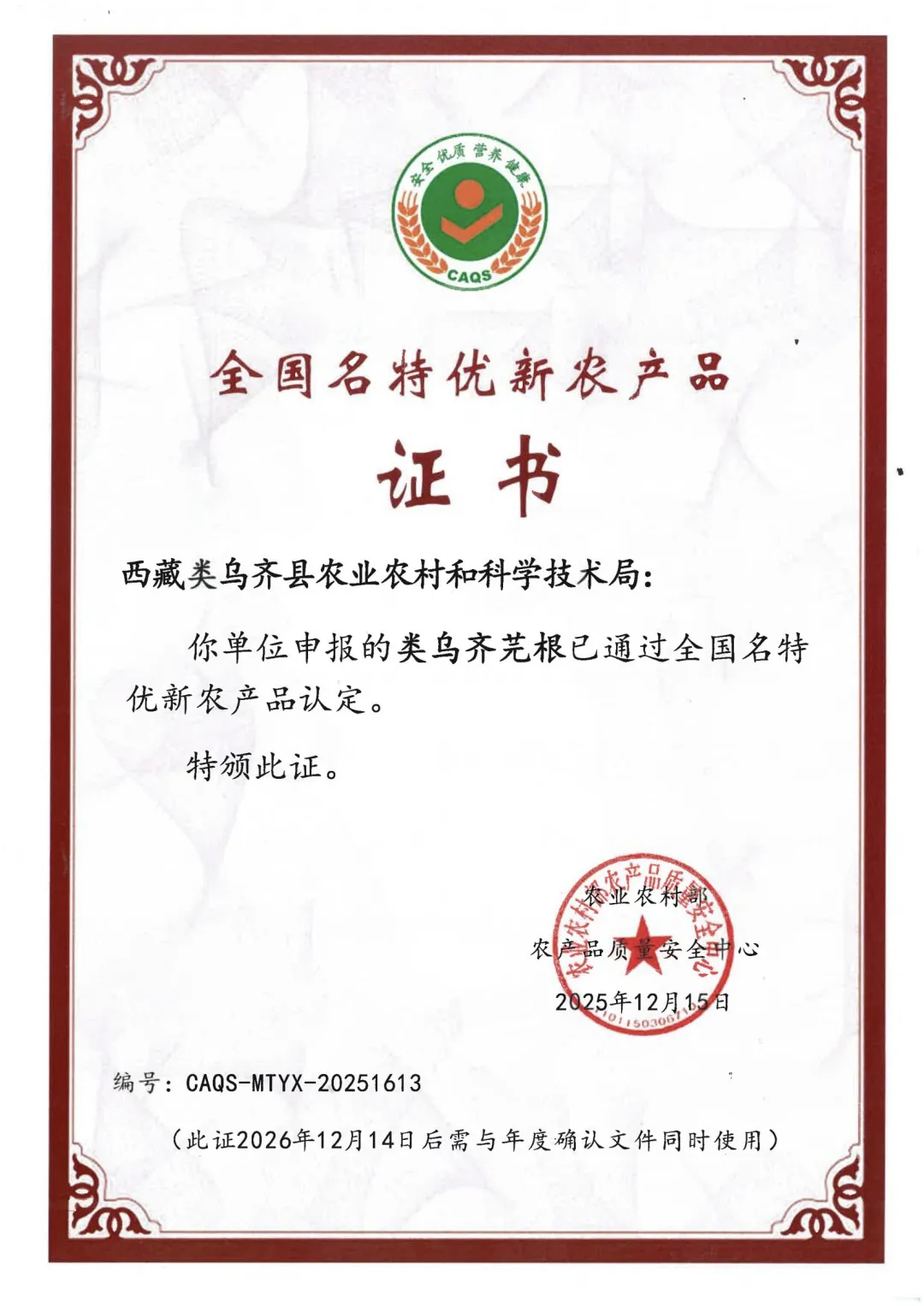 近日,农业农村部农产品质量安全中心公布新一批全国名特优新农产品名录,类乌齐芫根(藏语名“妞玛”)凭借独特地域品质、优良营养特性与深厚产业基础成功入选,为类乌齐高原特色农业高质量发展注入强劲动力。