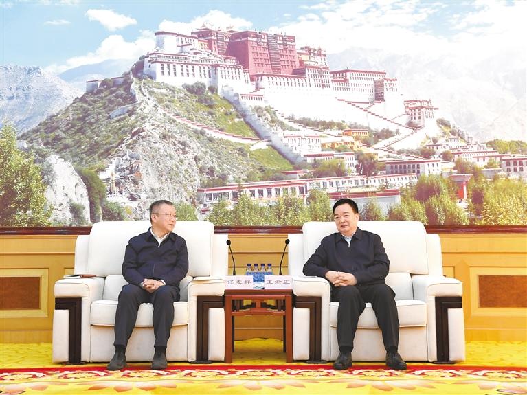 18日,自治区党委书记王君正在拉萨与山东大学党委书记任友群,校长、中国工程院院士李术才率队的赴藏考察团座谈。